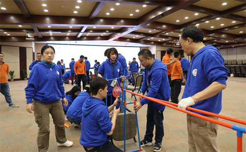 奋发篇:挑战动力绳圈,全体员工围坐成一个圆圈,每个人双手握紧绳子,用力向后拉,拉成一个同心圆,邀请了团队中体重最轻和最重的两位成员在绳圈上行走,感受了建屋平台的力量。