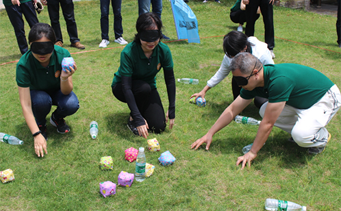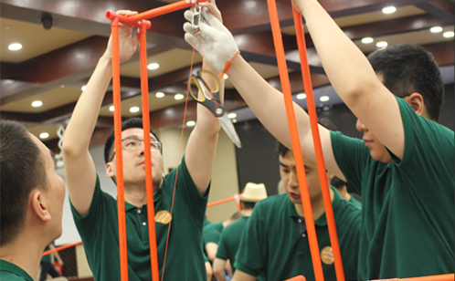 热身结束后,所有人员被分成六个小队,以新的组合分别开展了 “最强大脑”、“同心鼓”两个活动争夺赛。为了能在下午的“戈德堡”环节中能获得最佳资源、为了团队的共同荣誉,各个小组成员都挑战自我、拼搏奋斗,不惧烈日、不畏艰难。