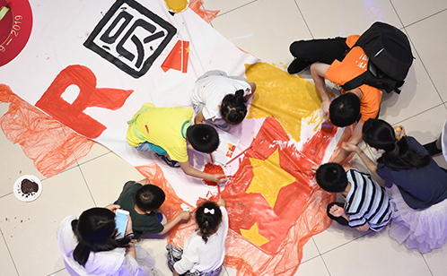 快闪结束后,新建元圆才党员、群众还邀请现场市民,拿起手中画笔,共同参与“放歌新时代、共绘新蓝图”主题彩绘环节。现场参与者分为六个小组,在指导老师的引导下,通力合作,奋力挥笔。不到20分钟,纯白色的画卷已经被赋予了新的色彩和丰富的内容,大家齐心聚力将六块画布拼接在一起,对党对祖国的深情厚意也生动的描绘而出。