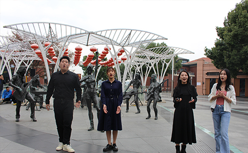 快闪现场,气氛超燃。刘辰旭、黎珂、于凇、刘可嘉4位文艺演员携手献唱《梨花颂》、《我和我的祖国》、《不忘初心》、《饮酒歌》等中外精粹曲目,用轻松愉悦的节奏、充满青春的活力,让现场交付于令人沉醉的欢乐中。