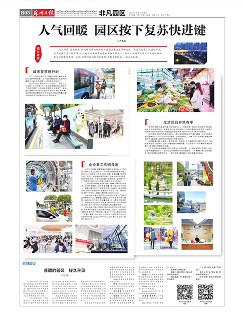 气温渐高,阳光明媚,新冠肺炎带给城市的阴霾也在春光里渐渐走远。街道又迎来了熙攘的车流,企业吹响了复工的号角,人们的欢声笑语开始在城市各处弥漫……苏州工业园区正活力十足地日渐恢复往日的繁华表情。当然,疫情防控的弦仍在紧绷,不到全胜时刻,一刻也不松懈。