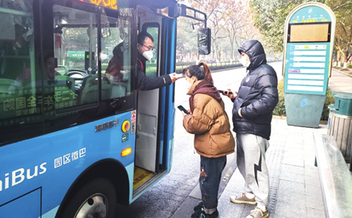 在公交站台,等车的人们又出现了。园区公交公司自2月10日起,对11条线路高峰时段车班进行了加密,恢复了3条线路,新惠巴士也增加了7条线路的高峰车班,并派出微巴车用于交通应急保障。在恢复正常运营的苏州轨交站内,乘客们佩戴口罩完成测温、实名制登记后方可排队候车。