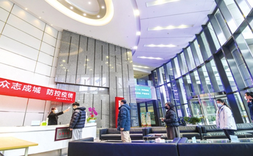 工作日的早高峰,新建元旗下圆融大厦内井然有序。白领们排着队,进行体温测量、身份登记后方可进入。圆融大厦内吸引了园区税务局、交通银行、税务师事务所、科技公司等政府、金融机构及企业入驻。秉持防控、复产“两手抓”,圆融大厦的复工率已近100%。