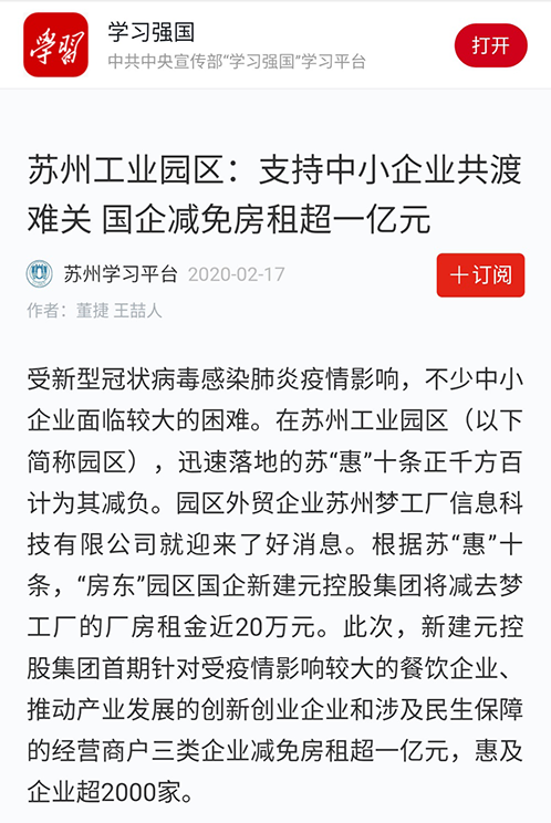 受新型冠状病毒感染肺炎疫情影响,不少中小企业面临较大的困难。在苏州工业园区(以下简称园区),迅速落地的苏“惠”十条正千方百计为其减负。园区外贸企业苏州梦工厂信息科技有限公司就迎来了好消息。根据苏“惠”十条,“房东”园区国企开云在线开户将减去梦工厂的厂房租金近20万元。此次,开云在线开户首期针对受疫情影响较大的餐饮企业、推动产业发展的创新创业企业和涉及民生保障的经营商户三类企业减免房租超一亿元,惠及企业超2000家。