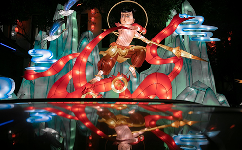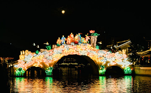 本次活动以“跨越山海 万物热爱”为主题,选取了中国传统神话故事中反映积极向上,能够鼓舞人心的神话传说和能够体现中国传统文化的人文理想或安居乐业的美好愿望的这两类题材进行设计制作。通过灯光亮化布置,将苏州灯彩与苏式园林建筑相融合,形成了一种穿越时空,美轮美奂的场景体验;既保持了苏州灯彩“精、细、美、巧”的艺术特色,又结合了斜塘老街街区特点,融灯于景,情景交融。斜塘河畔的桨声灯影,让人仿佛又回到了数百年前“月与灯依旧”的繁华盛景。