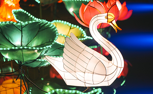 另外两个主景灯“鱼跃龙门”、“哪吒闹海”也十分抢眼,主体造型分别是一“山”、一“海”,极具中国写意山水画的水墨配色和造型线条,整体大气精巧,色彩搭配协调。观景灯中最吸引眼球的就是“星河梦影”了,灯组名称取自元代诗人唐温如的诗句“醉后不知天在水,满船清梦压星河”,一百多米长的紫藤长廊上挂满了数百个各式装饰花灯,走进廊里满天“星光”,就像走进一个流光溢彩的梦。