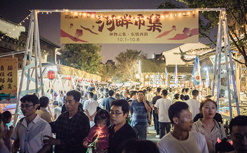 除了苏州灯彩主题亮化布置,新建元圆融斜塘老街在国庆长假期间每天16:00-20:00还举办了河畔市集。复古文创、手工潮玩、非遗文化、国潮演艺……各路神物云集,好吃的、好看的、好玩的一应俱全。
