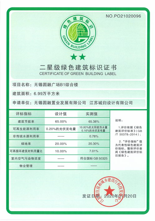 新建元·无锡圆融广场南地块B1综合楼继2019年9月获评二星级绿色建筑设计标识证书后,日前,又顺利通过省住房城乡建设厅绿色建筑专家评审,获得江苏省二星级绿色建筑标识证书。
