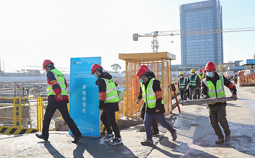 此次演练模拟场景为:科技载体项目3号基坑在开挖时,基坑下部“坑中坑”失稳出现坍塌,正在作业的一名施工人员被土方掩埋,无法脱困。安全员发现后,第一时间向项目部应急救援领导小组报告险情,应急救援领导小组立即启动应急预案,物资、设备保障组、现场监测疏散组、现场应急抢险组、危险源控制组、现场医疗救护组各就各位,迅速开展救援。同时,项目部应急总指挥立即向上级汇报事故情况。经合力救援,被埋工人被清理出来。经过心肺复苏,伤者生命体征平稳。等候救护车到来,伤者被送至医院。经现场救援小组确认无二次事故发生,现场应急响应终止,演练结束。