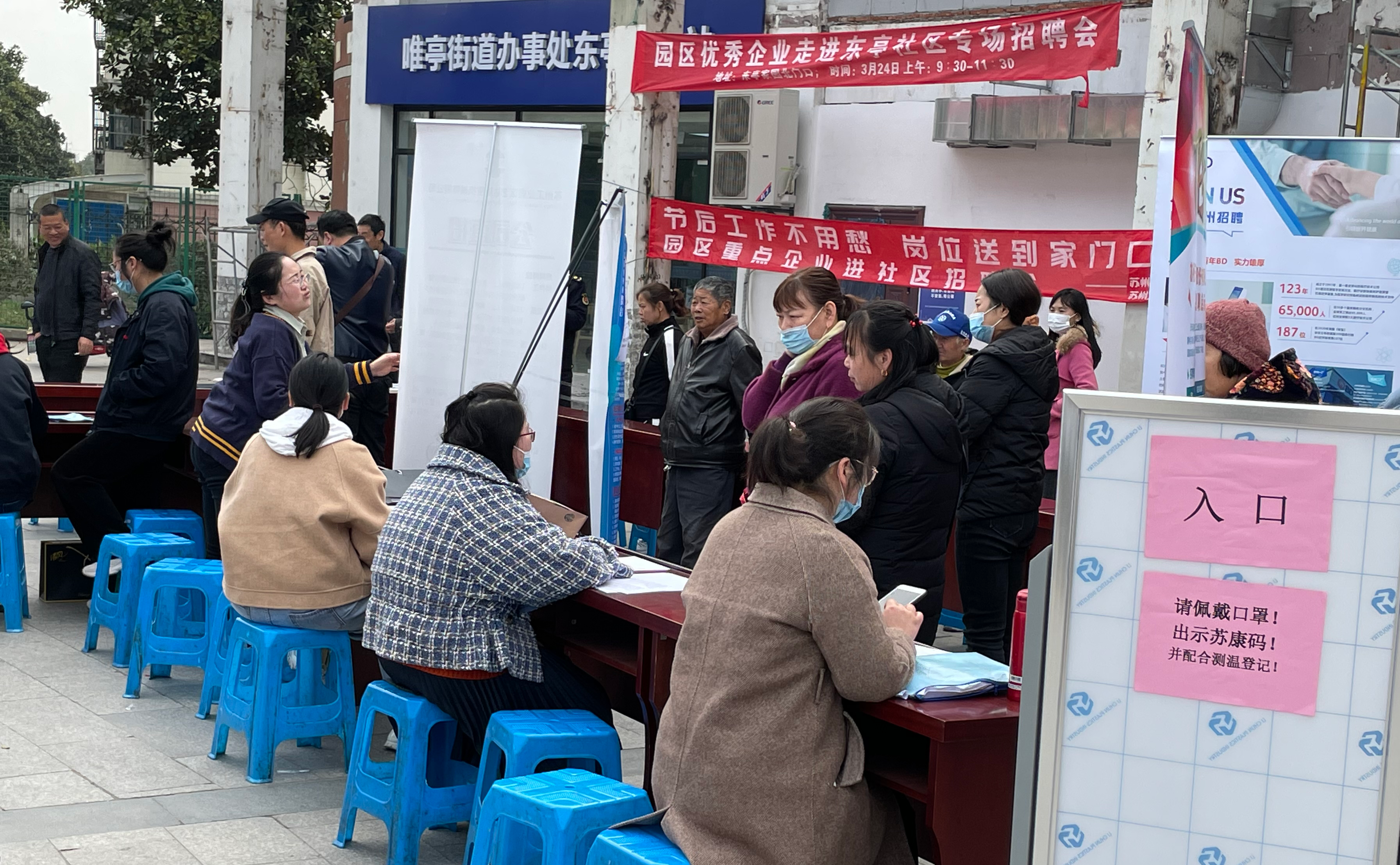 为持续满足园区企业用工需求,精准服务社区居民就业工作,3月22日、24日,胜浦街道吴淞社区、唯亭街道东亭社区分别开展送岗位进社区活动。作为园区“留在苏州、‘就’在园区、乐在金鸡湖”系列就业服务举措之一的园区重点企业进社区招聘活动,已成功举办七场,累计194家次企业参加。