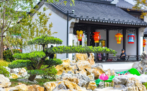 它是一处商业街区,汇聚了来自苏州的书香府邸旗舰店、宿迁本地特色店“金辉盛筵”、主打生猛海鲜的“渔舟村”、美味地道的苏帮菜馆“小园楼”等特色商户;它是一处园林景区,有“皱瘦漏透”的太湖石翼云峰、寓意长寿的涵碧轩山花、仿若仙境的蓬莱庭院以及粉墙黛瓦、飞檐翘角、垒石堆山、小桥流水等;它是一处文化社区,有老字号中医馆雷允上、凝结苏宿情谊的苏宿工业园区城市展览馆、展示“百匠赋新”的苏工苏作馆,汇集了苏州最具代表性的灯彩、核雕、宋锦、明式家具、船点、苏绣等手工艺作品。