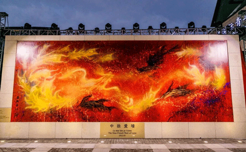 2022苏州金鸡湖苏州金鸡湖中法文化艺术周系列活动于10月28日至11月7日在中国苏州与法国巴黎同时举办。李公堤中法爱墙作为中法文化交流的艺术地标,是园区江南文化与国际潮流融合展现的窗口。朝北一面是世界知名艺术装置《爱墙》(Le mur des je t’aime)亚洲唯一复制品,按照原型1:1复制。朝南一面是国际知名街画艺术家、多次吉尼斯世界纪录创造者齐兴华的作品《龙凤呈祥》。龙起九州生瑞气,凤随云彩舞风华,呈现出绚烂重彩的吉庆图景。在李公堤,中法文化关于“爱”的不同语言,跨越时空交相辉映。
