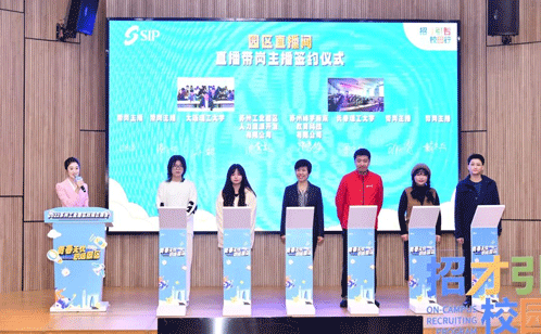 现场,新建元圆才总经理沈莺燕与峰学蔚来、研途教育创始人张雪峰、大连理工大学招生就业处副处长郑皓、长春理工大学就业创业指导中心主任贾彦彬,以及金鸡湖大赛获奖主播谢妍珍、王钰涛、万亚婷、戴冬兵签约合作协议,共同搭建“园区直播间”。未来,园区将进一步探索“政府搭台、企业聚力、平台支持”校园招聘新模式,拓展“直播探企”“云上岗位进校园”等线上活动,以轻松愉悦、喜闻乐见的形式,走进青年心坎,打响园区品牌。