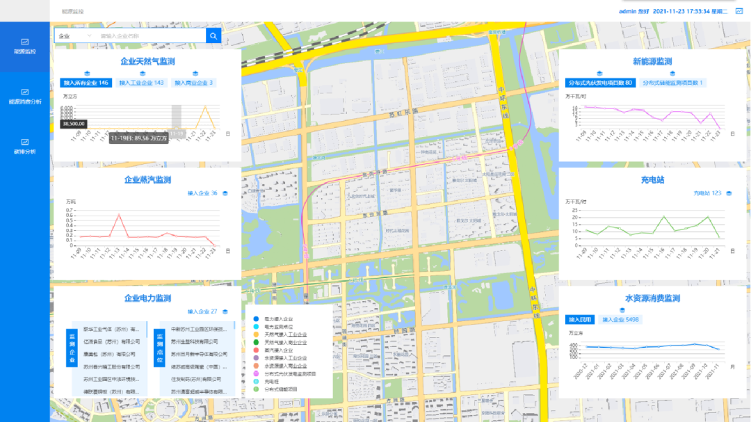 目前,系统已建设完成并投入运营,累计接入企业5757家,光伏项目101个,充电站123个。系统通过实时和历史能源数据监测,对水、电、气、新能源用能进行预警管理;通过能源消费分析,对重点规上企业用能进行趋势预测;通过碳排分析和节能审查,对用能企业进行过程跟踪,旨在为早日实现碳达峰碳中和提供可追溯的数据参考和决策支撑。