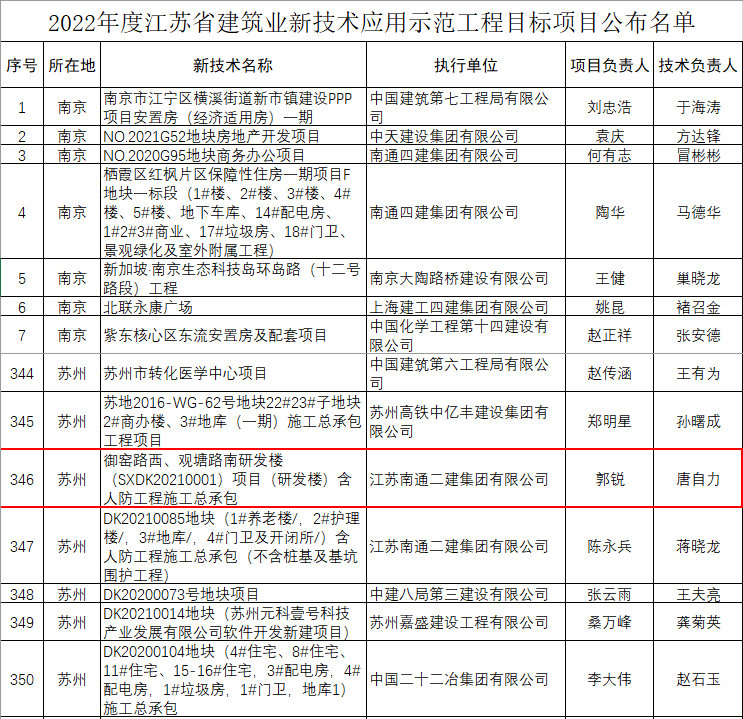 成功入选2022年度江苏省建筑业新技术应用示范工程目标项目名单
