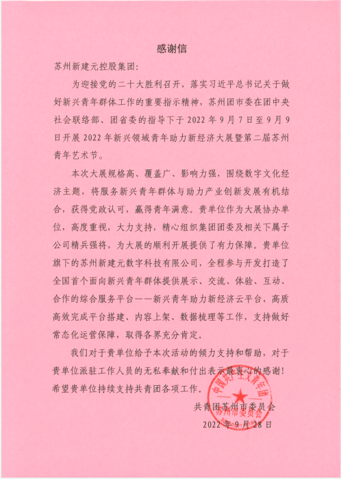 近日,由共青团中央社会联络部指导,共青团江苏省委主办,共青团苏州市委、苏州市文联承办的2022年新兴领域青年助力新经济大展暨第二届苏州青年艺术节在苏州开幕。新建元数科全力支撑新建元集团协办此次活动,倾力打造的“新兴领域青年助力新经济大展”云平台在开幕式上正式发布上线,获得了团中央社联部的充分肯定以及团市委的致信表扬。