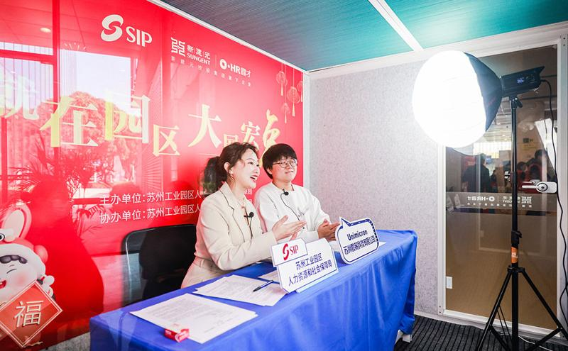 除了现场招聘的如火如荼,线上云聘、直播带岗也人气满满。招聘大厅西侧的直播间里,首场直播邀请群策科技、通富超威、亿滋食品、贝卡尔特新材料等园区重点企业参加,带来18个岗位169个招聘需求,吸引了4183人次线上观看,收到简历358份。