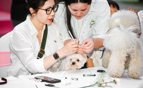 此外,DIY手作工坊也吸引了众多宠物主人的参与。他们亲手为爱宠打造独一无二的鲜花项圈和香薰石膏礼物,传递着对宠物的深深爱意。