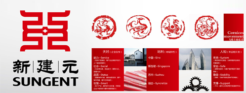 “只有民族的,才是世界的。”新标志的设计在形式上努力寻求着突破,不再一味地崇尚千篇一律的国际化,而是更多的从中国古代文化遗产中汲取精华,力求实现“中而新”。新建元的企业字号来自于中国历史上第一个年号——汉武帝“建元”年号,显示了企业开疆拓土、走向全国、开创全新纪元的决心。新标志以此发端,从中国古代建筑艺术的精华、包含着丰富文化内涵的“秦砖汉瓦”中得到灵感,从青龙、朱雀、白虎、玄武的汉代“四神瓦当”图案中提取出“S”的基因元素进行重组设计,并采用了中国红作为主题色,使整个标志图形简洁而赋有民族特色,形成了“飞檐上的乐章”的独特意向。